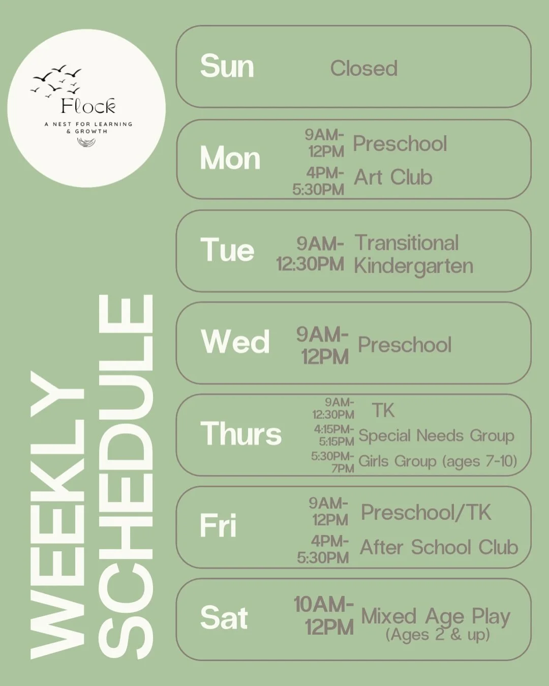 Our Classes At Flock, we are dedicated to fostering a nurturing community that embraces creativity and connection. Our mission is to provide a safe and welcoming environment for kids, teens, and families to grow, learn, and thrive together. A Place for Kids to Be. View fullsize View fullsize View fullsize View fullsize View fullsize View fullsize View fullsize View fullsize View fullsize View fullsize